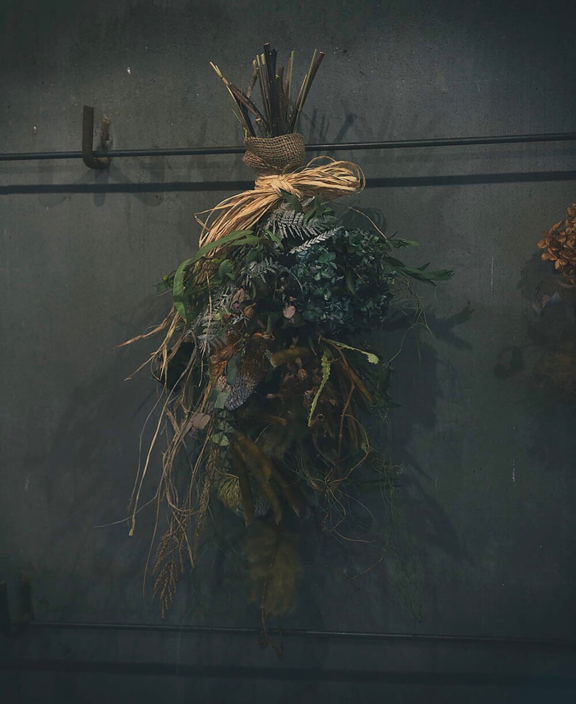 造形が格好いい、野生味ある花材を使用し自然な動きあるスワッグ